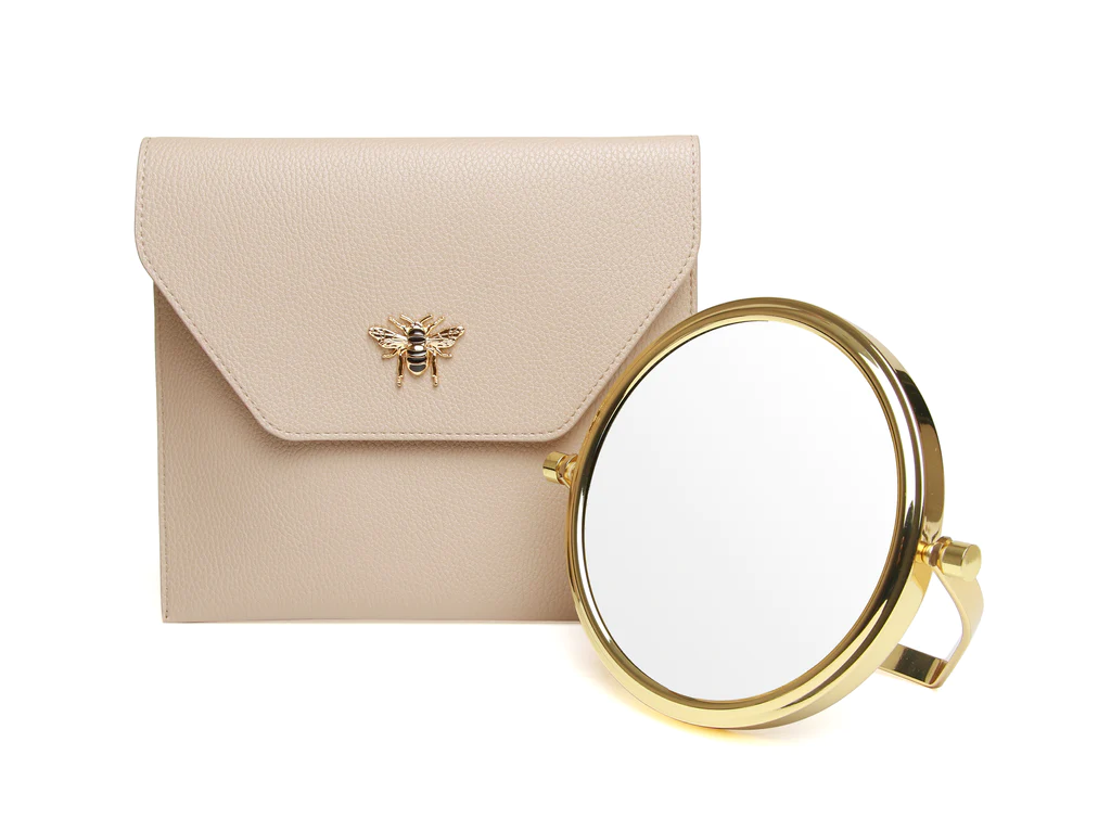Luxury travel mirror and travel textured vegan leather pouch, a chic and practical accessory for any journey. This gold mirror has two sides, one with 1x magnification and one with 7x magnification, so you can easily apply your makeup and style your hair. It folds flat and slips into luxury its pouch, which is adorned with a lovely Honeybee Logo.