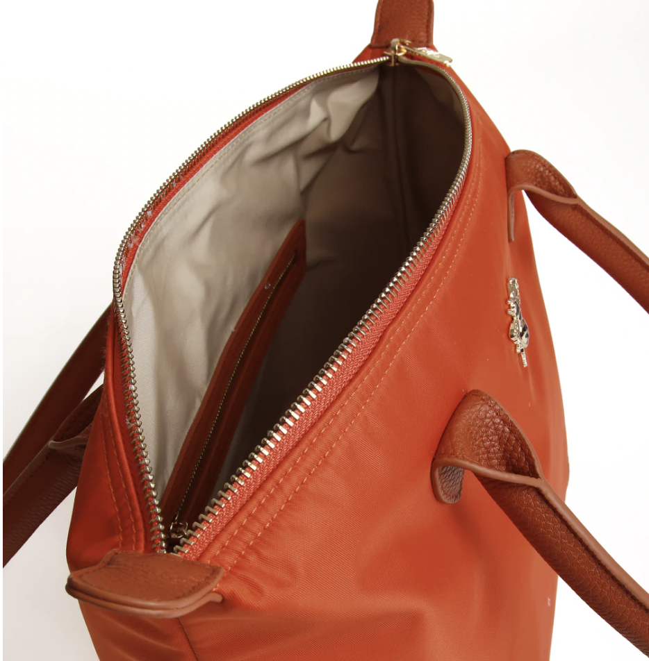 The perfect Purley Tote bag, crafted in super lightweight material with tanned vegan leather accents and designed to foldaway. The bag has a generous compartment, we use metal zipped fastening for added security, the compartment is fully lined and includes a large internal zipped pocket and further pockets for keeping all essentials in order.