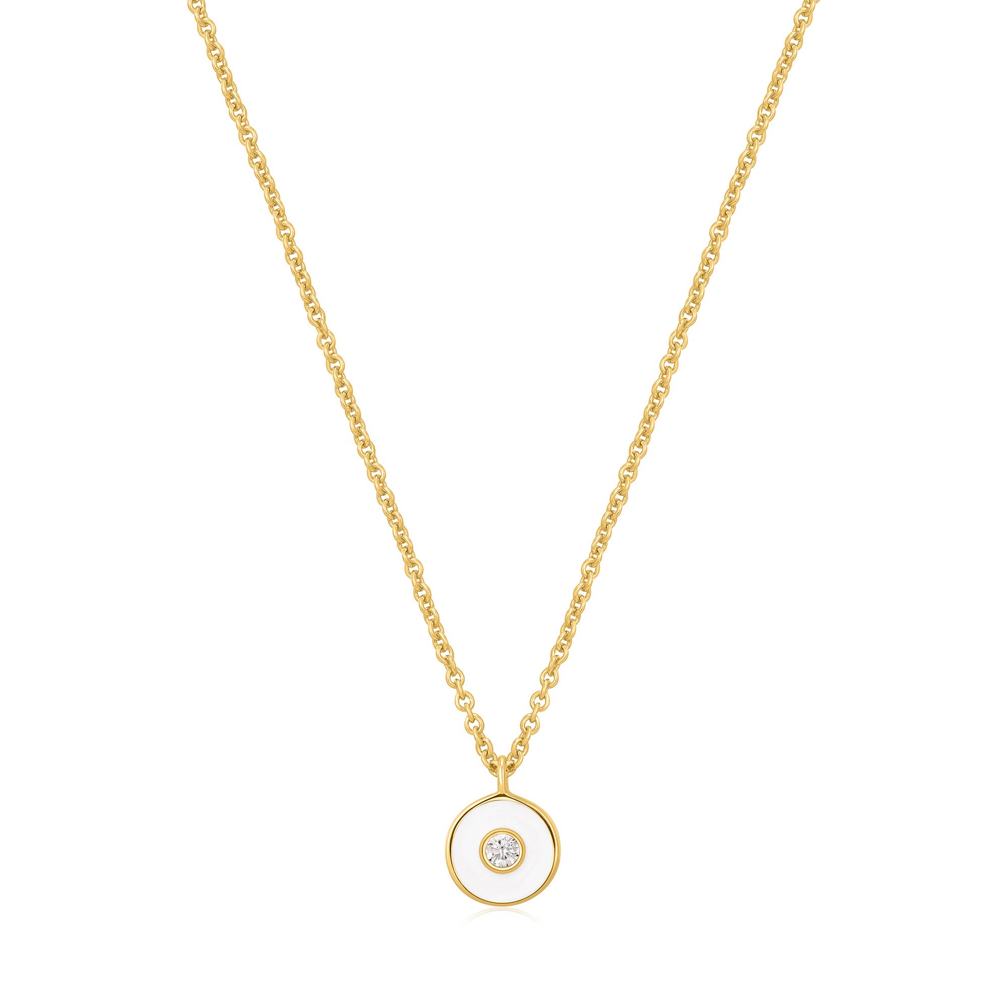 The perfect seasonal revival for the classic pendant, play with sparkle and colour in one with this unique disc necklace. Set on a simple delicate gold chain, we paired a single stone of cubic zirconia with a disc of our signature enamel coating for the colour pop you didn’t know you needed until now. The perfect day to night piece for every style.