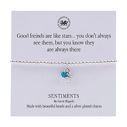Show her how much your friendship means to you with this adorable ‘Good Friends’ Sentiments Bracelet. It’s silver star charm and blue ‘Miracle’ bead dropper compliment these silver plated beads.