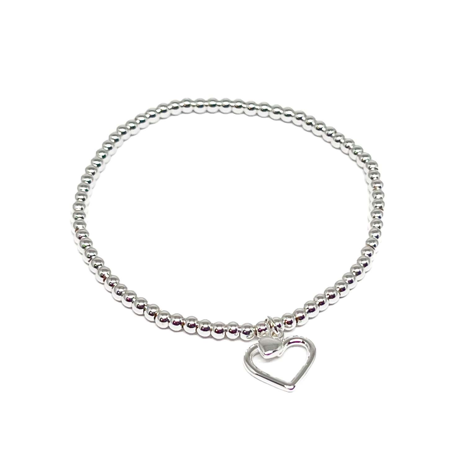 Silver heart charms on a silver plate beaded stretch bracelet.