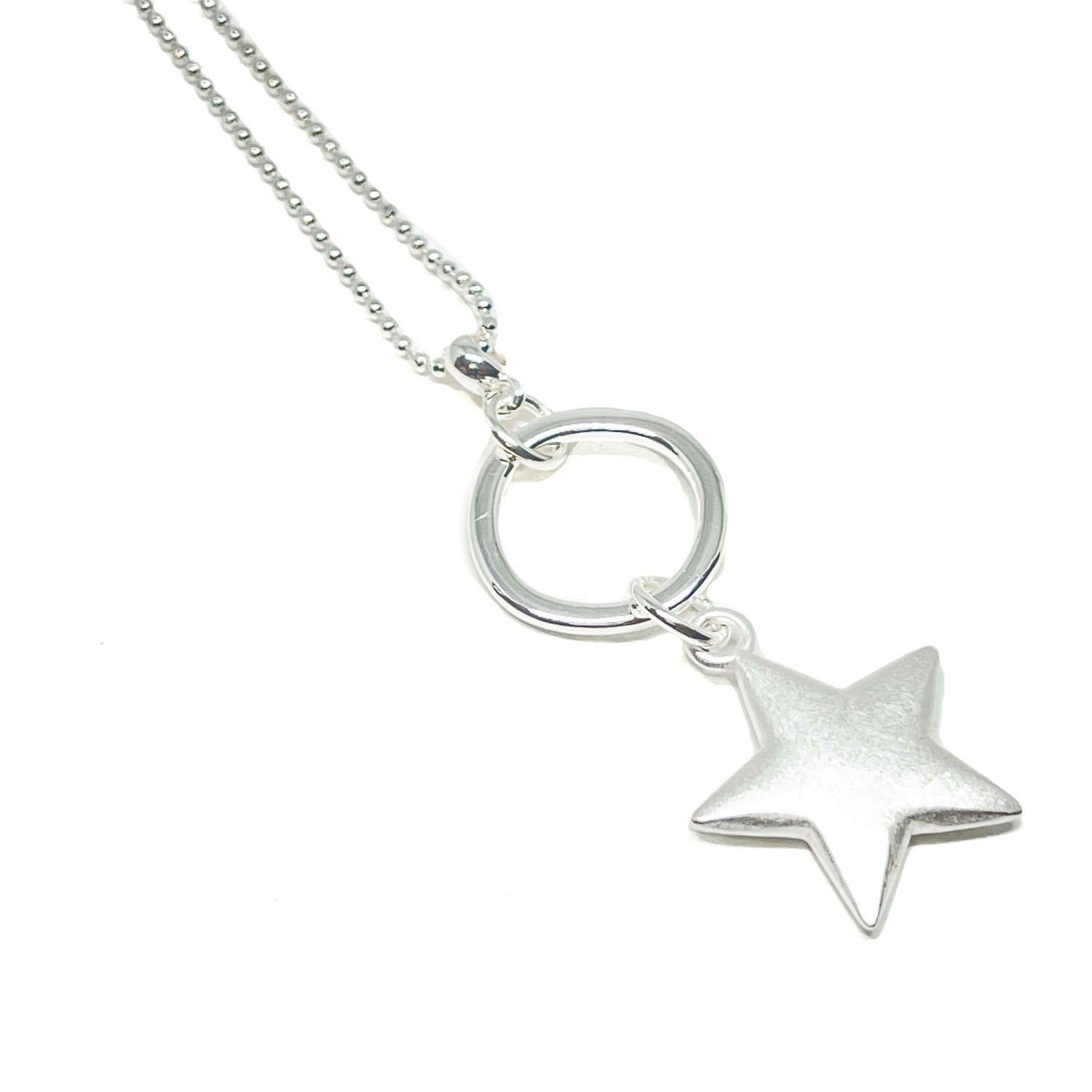 Silver plate ball chain necklace with silver star, 32″ chain length.