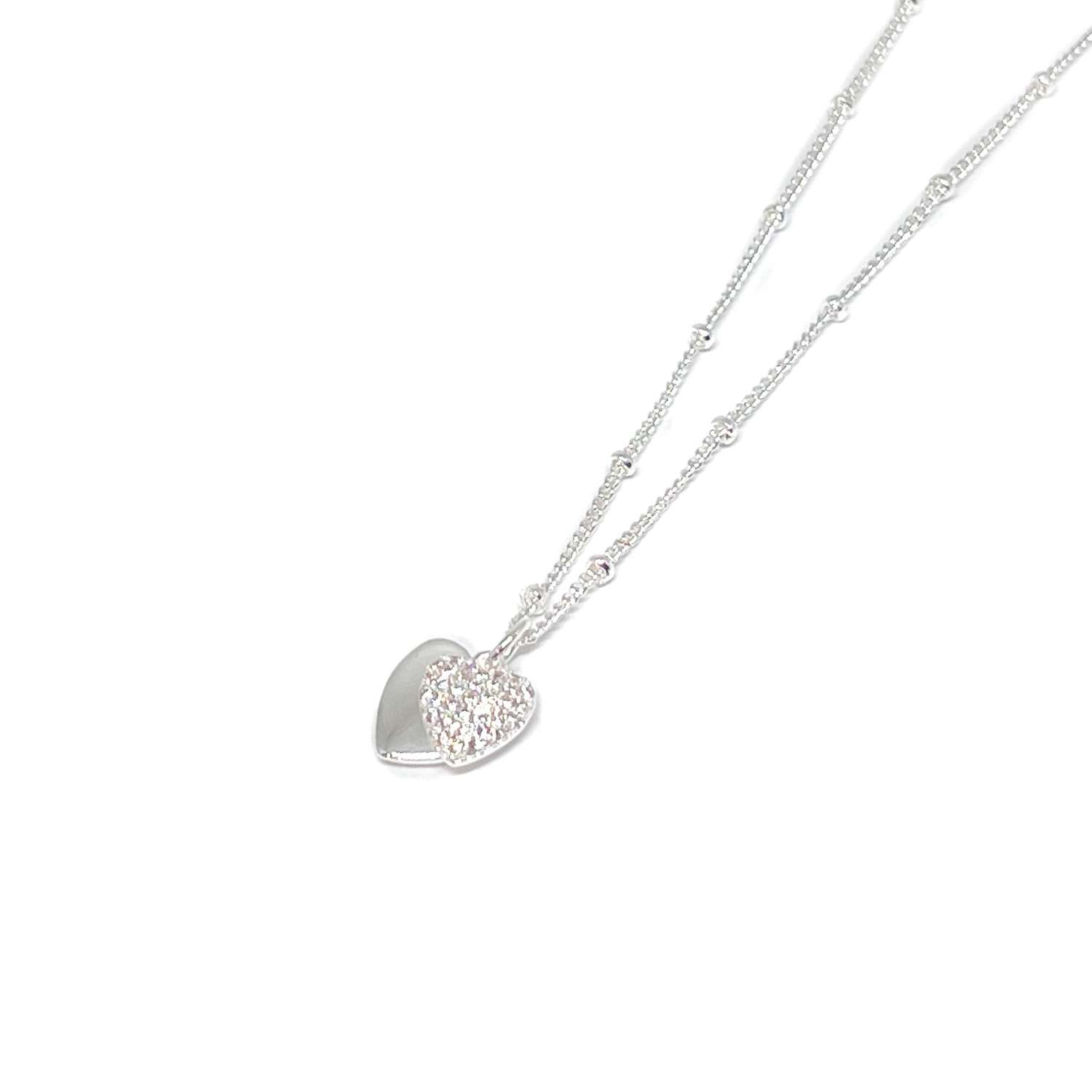 Set of two silver heart charms on a 16″ silver plate satellite chain with a 2″ extender chain and trigger clasp.