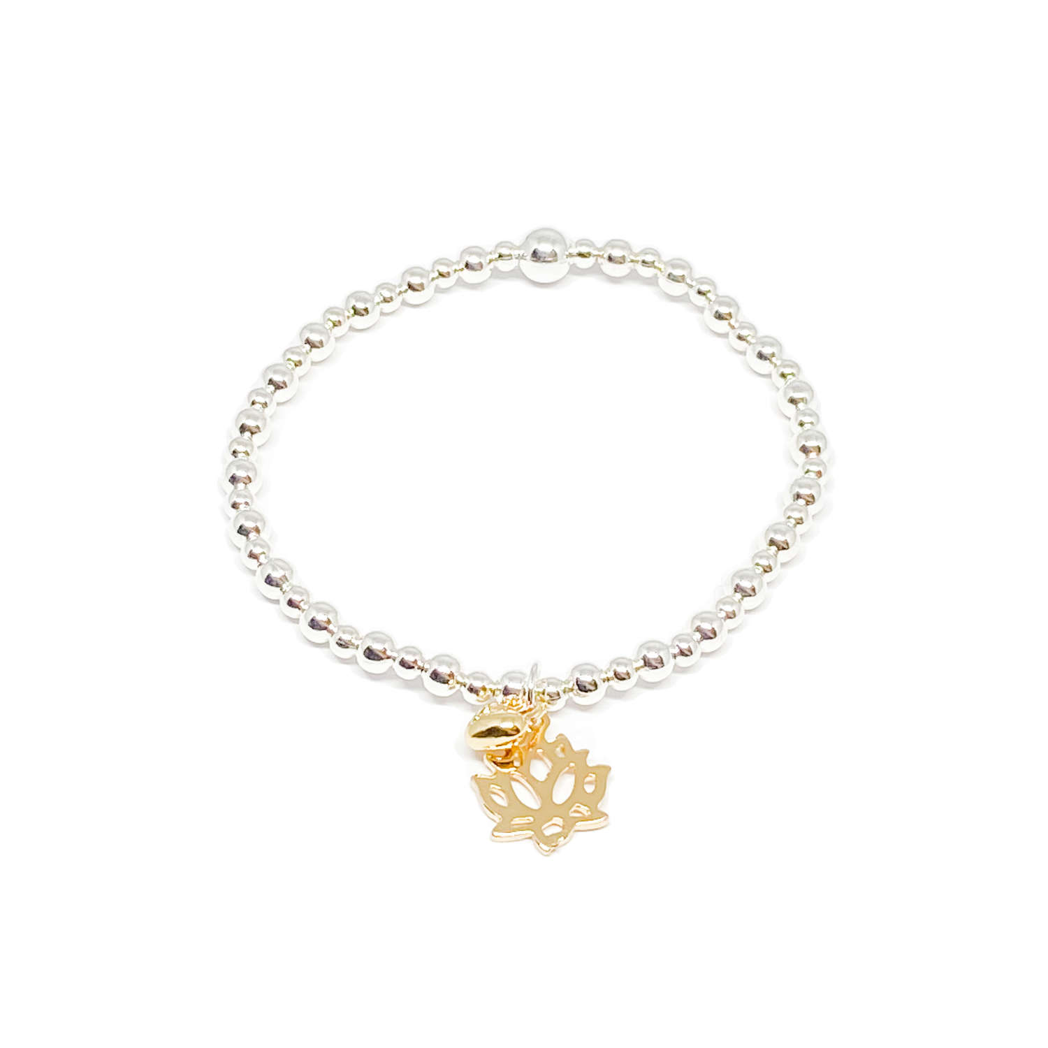 Gold Lotus flower & heart charm on silver plate beaded bracelet on stretch elastic