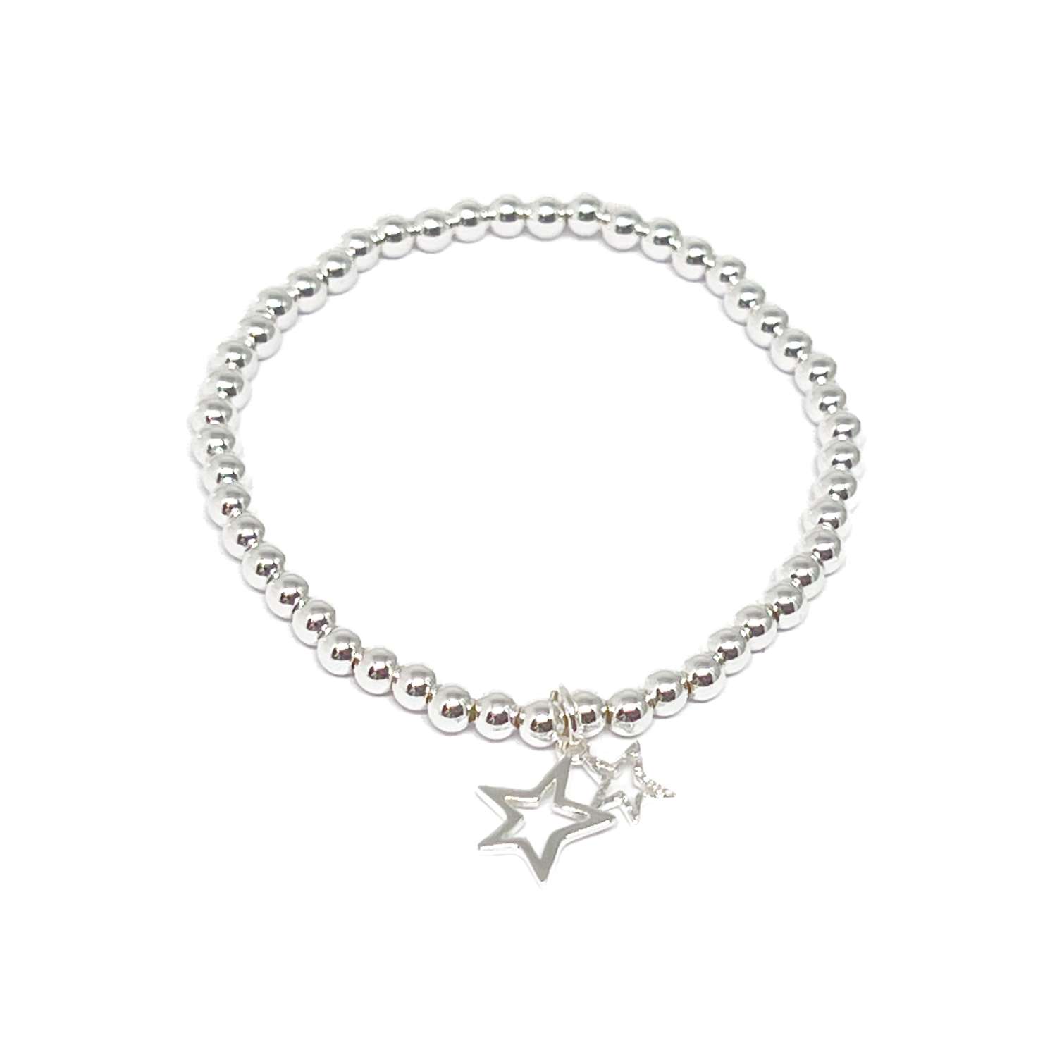 Silver star charms on silver plate beaded stretch bracelet.