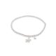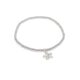 Silver teardrop charm on a silver beaded stretch bracelet.