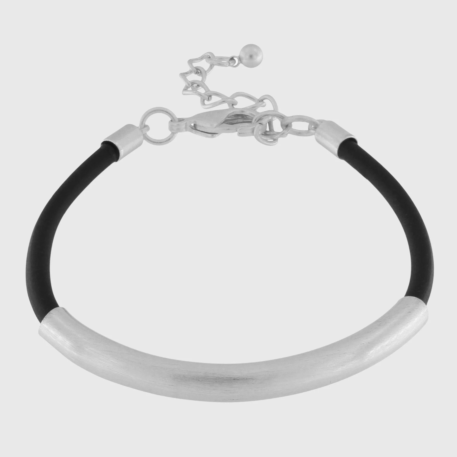 This silver plated rubber bracelet is a stylish addition to any wardrobe. Its simple design ensures a polished, eye-catching look, and its scratched surface finish gives it a unique charm.