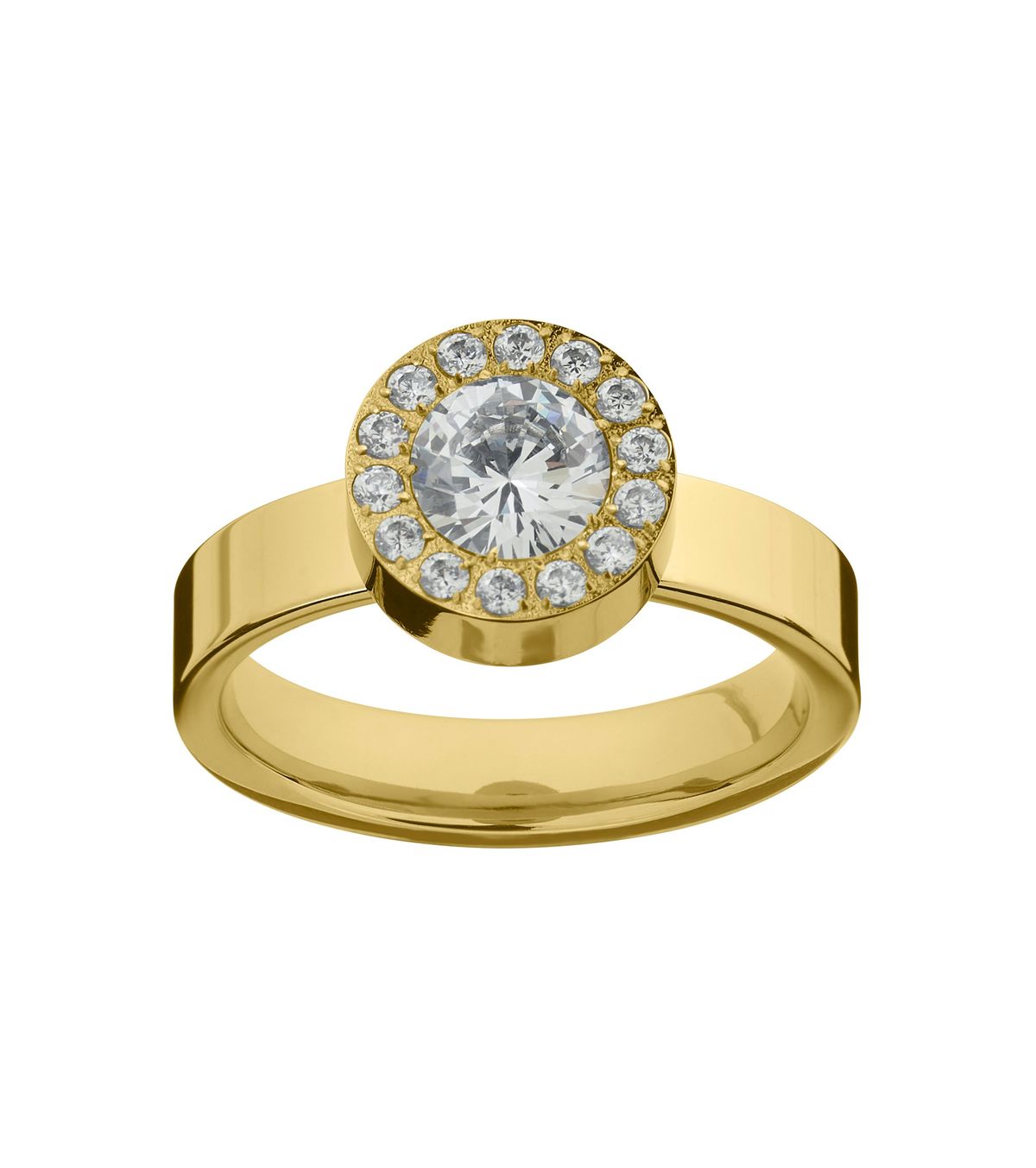 Gorgeous Thassos ring in shiny 14K gold plating features a large classic round stone which is encased by 14 smaller ones. The rail, which is stackable, is slightly curved making it very comfortable to wear. Combine Thassos with some of our other stackable rings like Glow.
