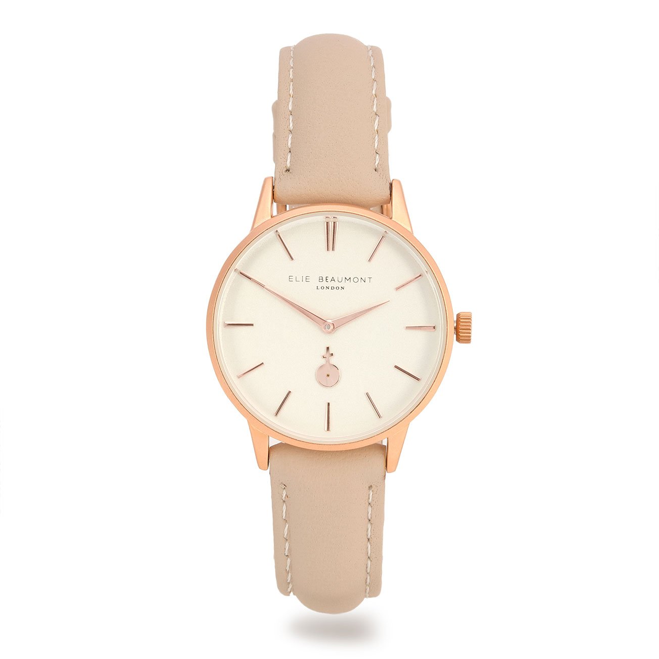 This Elie Beaumont metal watch features a large round dial design with stone nappa leather strap and rose gold case.