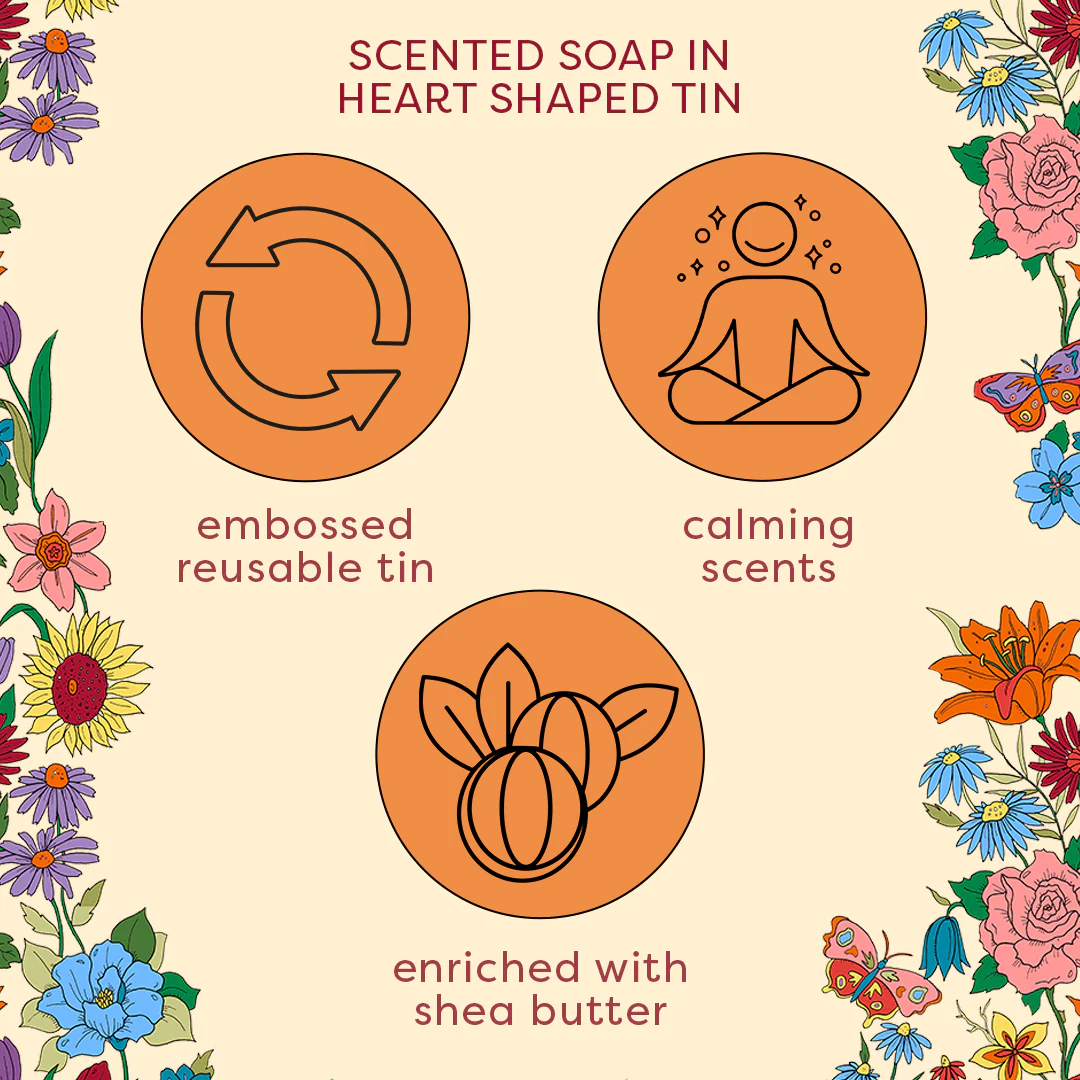 It’s a 70s love revival with our flower power heart shaped tin with scented soap inside. A perfect gift for young at heart, modern-day hippies and nature lovers.