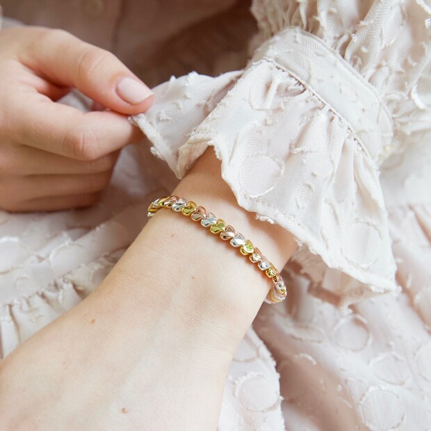 With its polished beads and simple style, this shiny beaded bracelet from Lisa Angel is a must-have for your everyday jewellery collection. The bracelet features silver, gold and rose gold heart beads threaded onto a strong elastic for easy and secure wearing on your wrist.