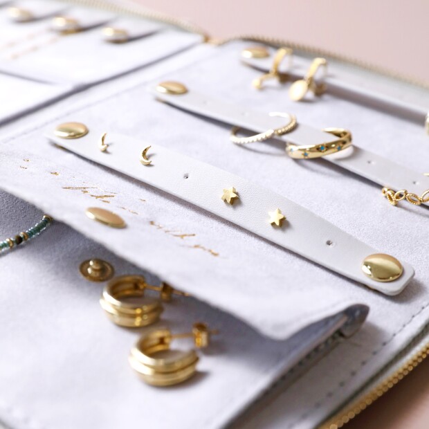 A wonderful wallet for your favourite selection of jewellery, this grey faux leather wallet opens via a zip to reveal pockets and poppers to secure your necklaces, bracelets and earrings. The velveteen lined inner will protect your pieces and keep them in their finest condition, with embossed ‘take me with you’ wording on a pocket to tuck extra precious items. Finished with a detachable strap to carry whilst at home or travelling away.