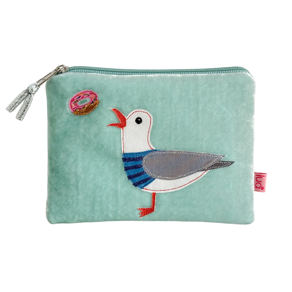 Inspired by a recent trip to Brighton, this fun purse in mint velvet features a cheeky doughnut grabbing appliqued seagull.