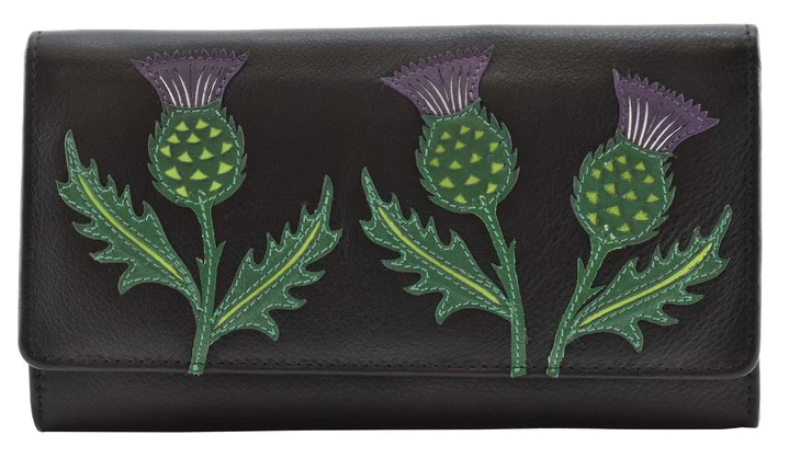 This unique thistle leather purse holds up to 9 cards and has two separate note sections. The internal zipped pocket holds change securely and the ID window is ideal for passes.