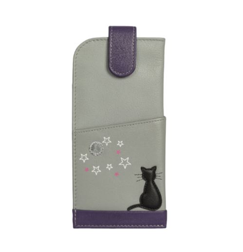his classy black cat leather glasses case has an easy open tab top and a soft cotton lining. The extra slip pocket on the front is ideal for cards or cleaning cloth.