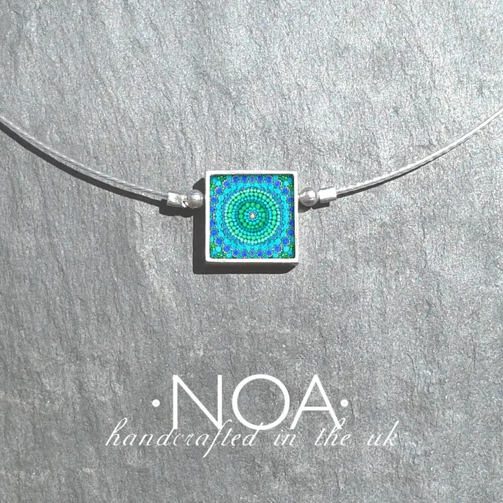 An aluminium framed square decorated ceramic strung on a nylon coated stainless steel 17.5″ wire.