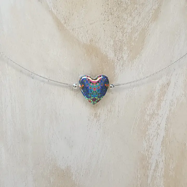 A heart-shaped ceramic strung on a nylon-coated stainless steel 16.5″ wire.