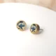 A pair of stud earrings. A gold-plated stainless steel case holds a decorated round ceramic with a sterling silver ear stud.