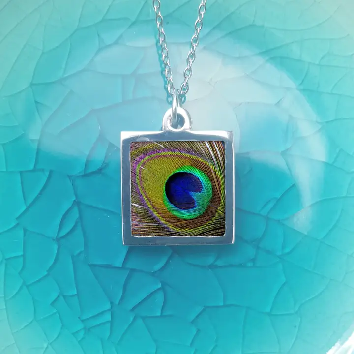 A square stainless steel frame holds a decorated walnut cut out. The pendant is strung on an 18” stainless steel chain.