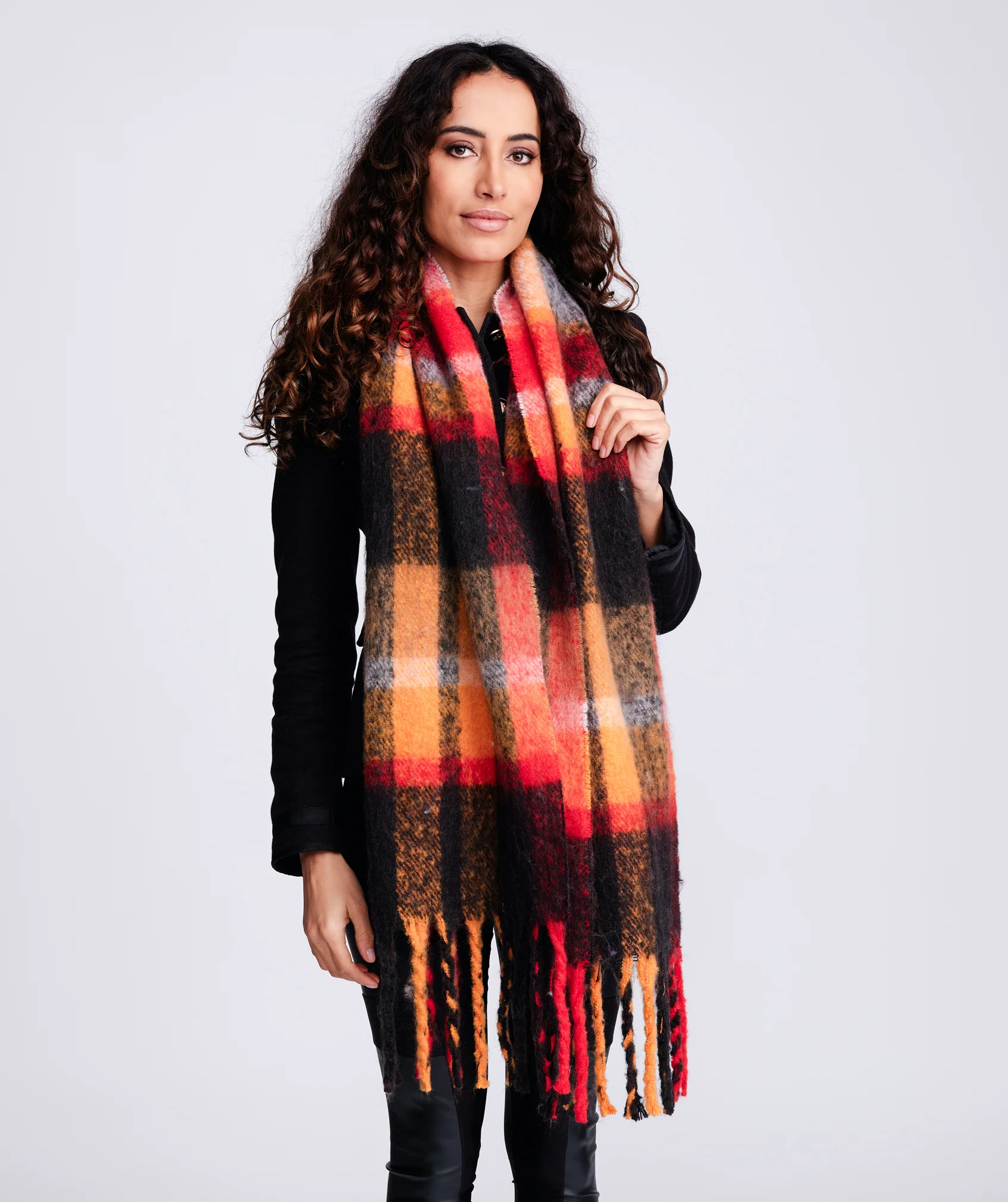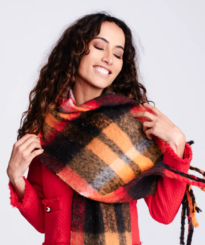 This is a blanket scarf that covers all the bases for your winter wardrobe addition. The oversized check pattern in black, red, and tones of orange makes this oblong blanket scarf a beautiful contrast piece. An extra-large fringed hemline adds eye-catching detail.