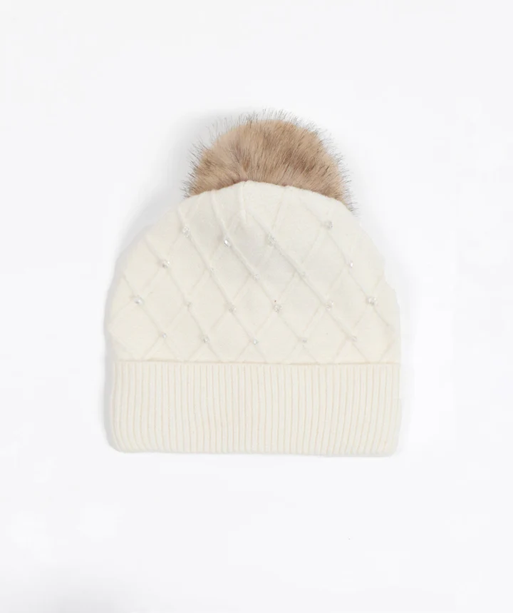 Made from super soft fabric in a wintery ivory shade it’s a knitted beanie with a stunning diamond pattern. The brim is classically ribbed. Embellished with rhinestones on diamond points in the knitting it will sparkle day and night while catching light. The luxurious and unbelievably soft brown faux fur pom pom looks like the real thing but is eco-friendly. While this beanie style looks casual, the elements of detail on this hat look luxe.