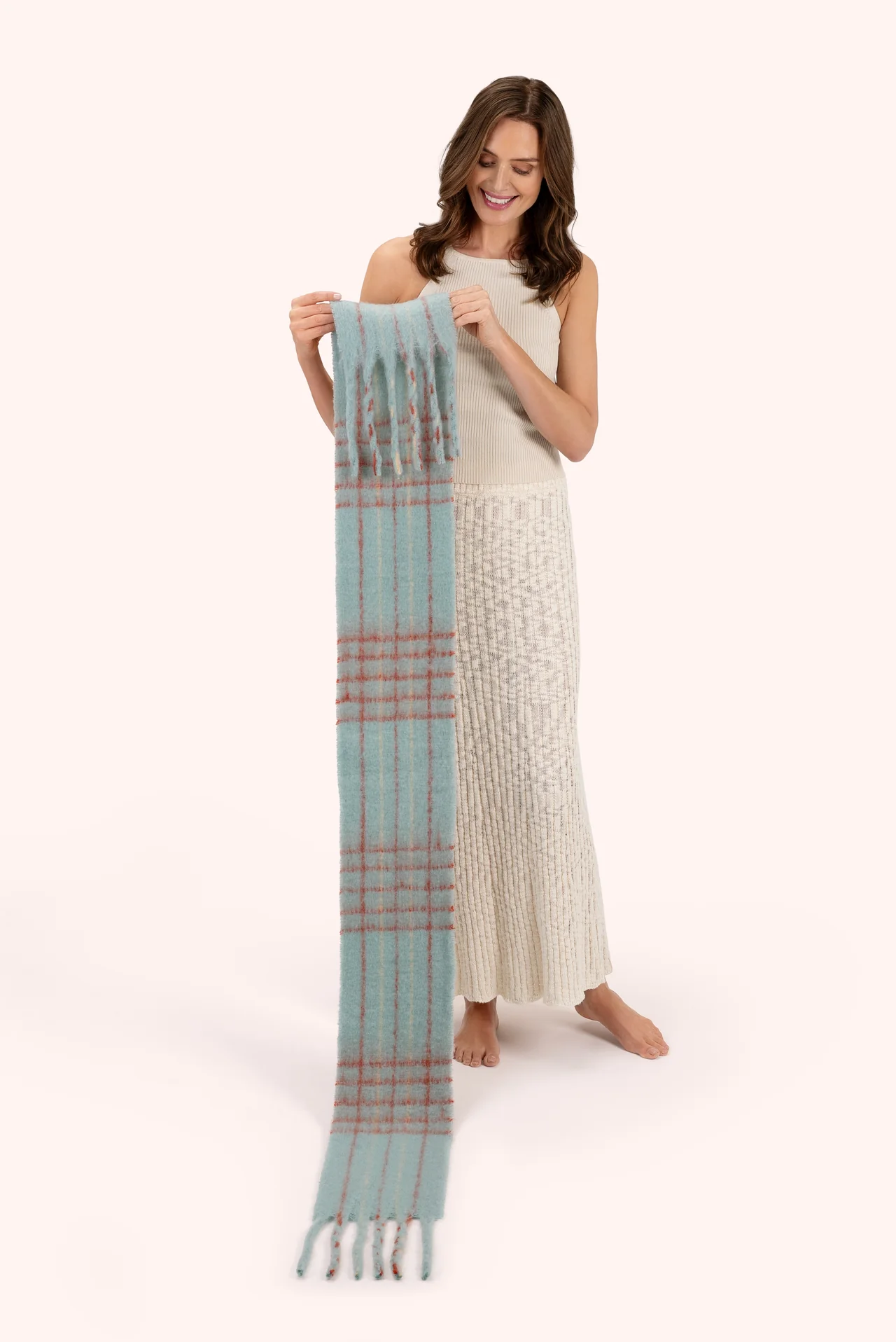 A fuzzy feel and preppy check pattern will have you grabbing for this Angelica scarf when you start to feel a chill in the air. Cool blue vs warm burgundy tones make this ideal if you are planning a coordinated look this season!