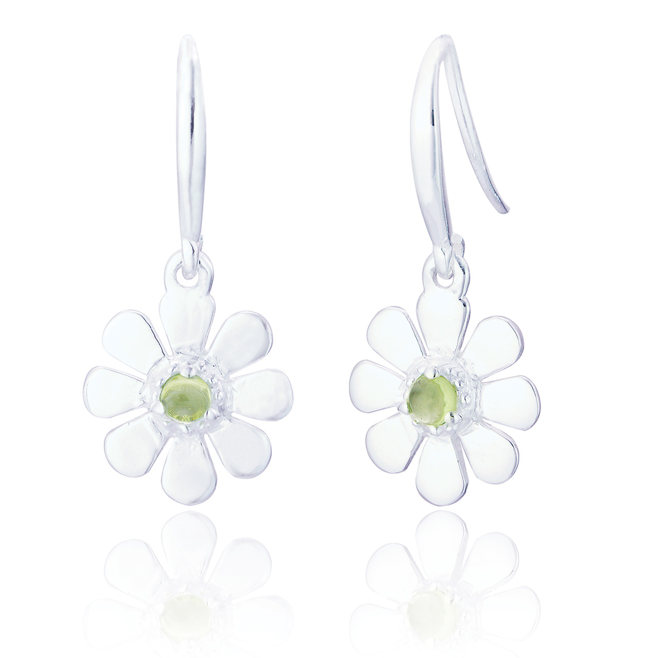 Pretty silver drop earrings in a daisy design with apple green peridot stones, said to bring good health, in a circular setting. Crafted from sterling silver with a high gloss finish.