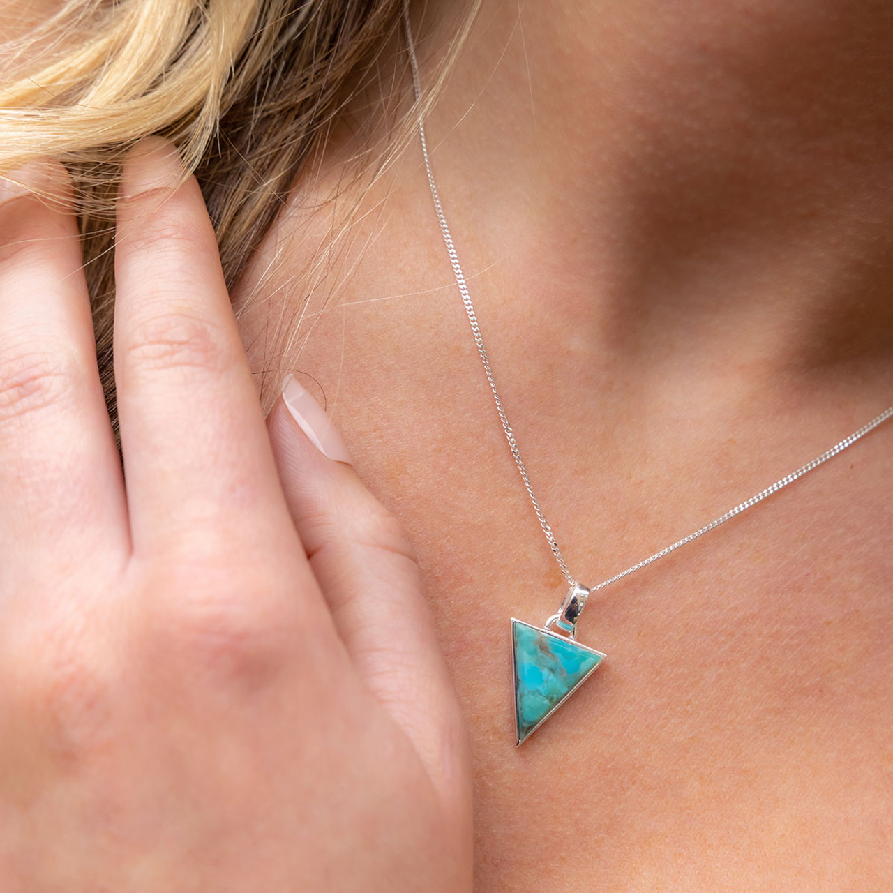Contemporary turquoise triangle pendant necklace. Due to turquoise being a natural stone, shade and colour variations will occur, meaning each piece is unique, a great selling point. Crafted from sterling silver with an extra layer of silver plate for a high shine finish.