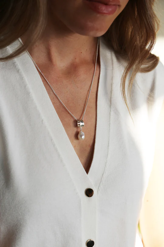 Brass base plated with Sterling Silver and Freshwater Pearl. Finished with an anti-tarnish, water resistant coating.