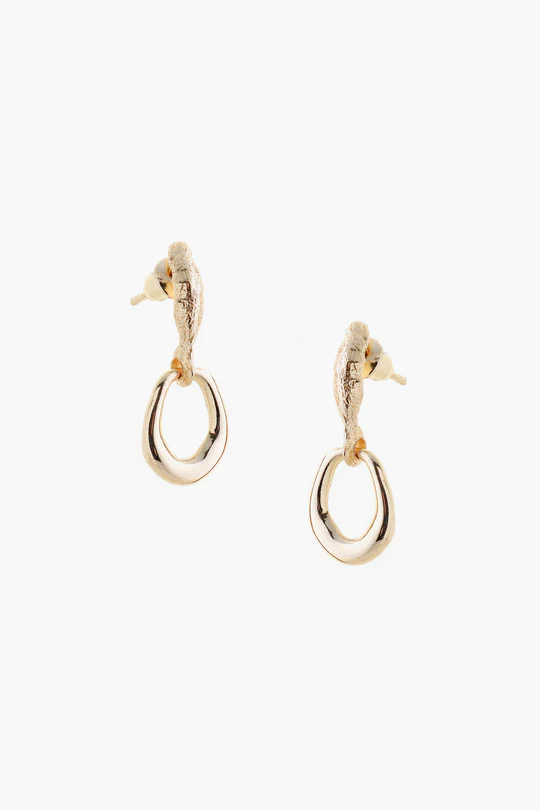 Stud back earrings, showcasing a uniquely-shaped front connected to a chunky drop hoop.