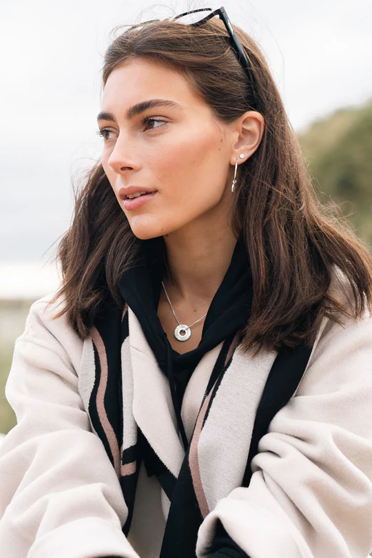 Brass base plated with Sterling Silver. Finished with an anti-tarnish, water resistant coating.