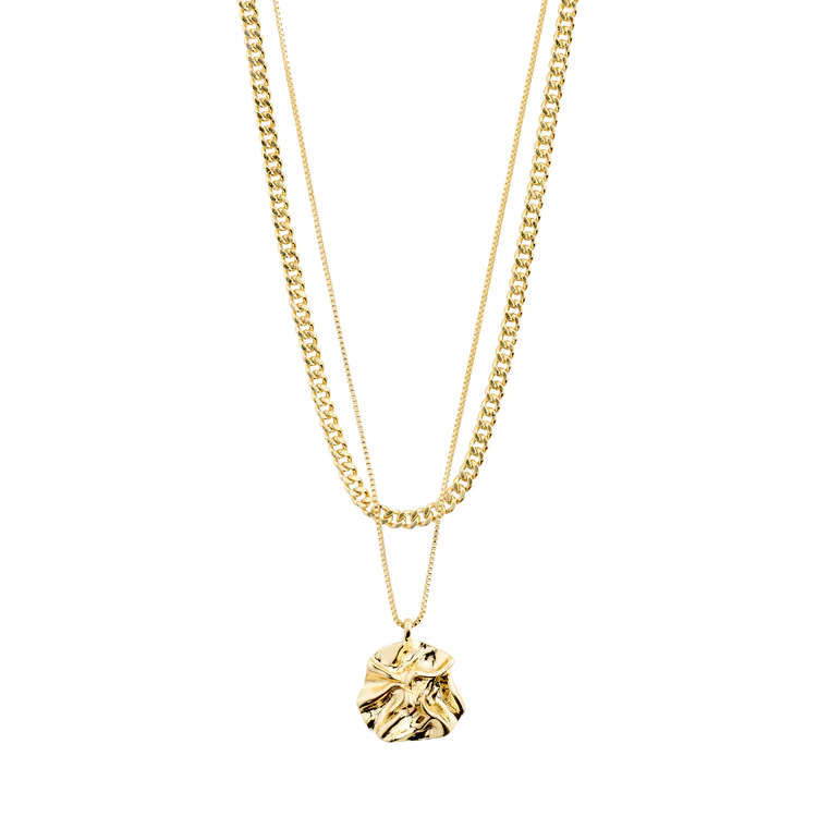 Discover nature’s beauty with these gold-plated necklaces from Pilgrim’s Willpower collection. The 2-in-1 set plays with contrasts and combines a feminine, organic pendant with a powerful curb chain. The pendant’s irregular shape gives a handcrafted feel to the chain, which can be worn alone or in combination with the curb chain in a stylish layered look.