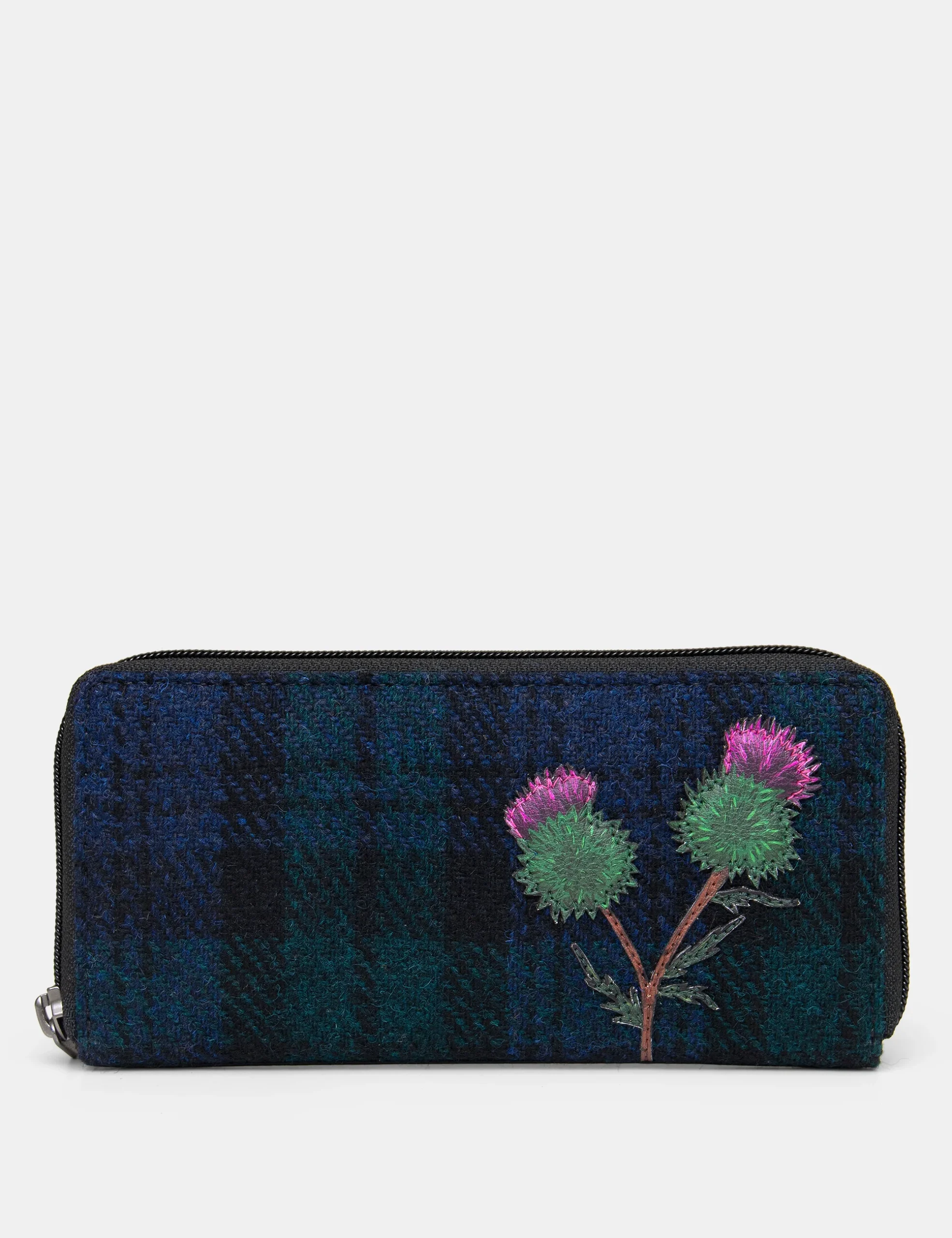 Our classic zip round purse features a highland thistle applique on the front of a Harris Tweed fabric panel and this purse has been made in a black leather. This classic purse silhouette offers plenty of storage with 8 credit card slots, multiple note sections and a useful zip coin pocket inside. RFID protection is also included as standard for your peace of mind.