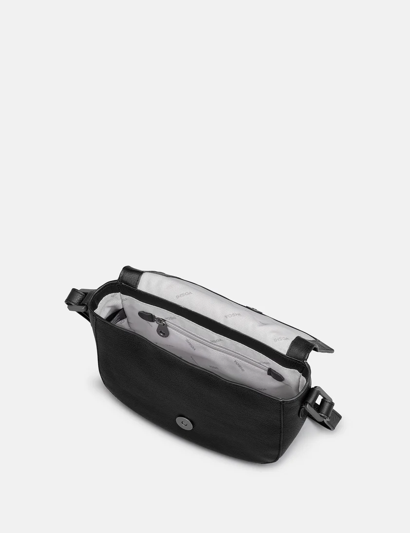 Yoshi Leather “Clarendon” Flap over Cross Body Bag – Black