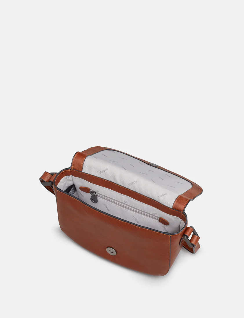 Yoshi Leather “Clarendon” Flap over Cross Body Bag – Brown