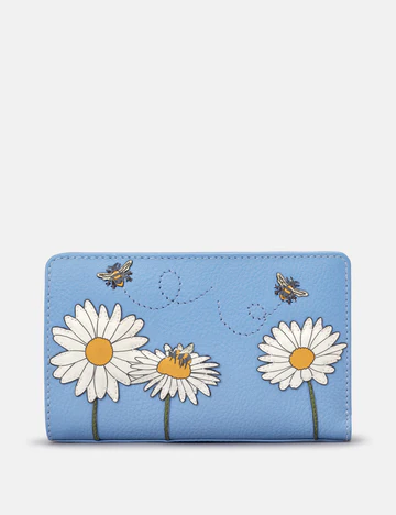Our Bee Happy soft blue leather flap over purse. This handmade women’s style has RFID Protection and features beautiful leather bumblebee and daisy flower appliques on the front and has space for cards, coins, and bank notes.